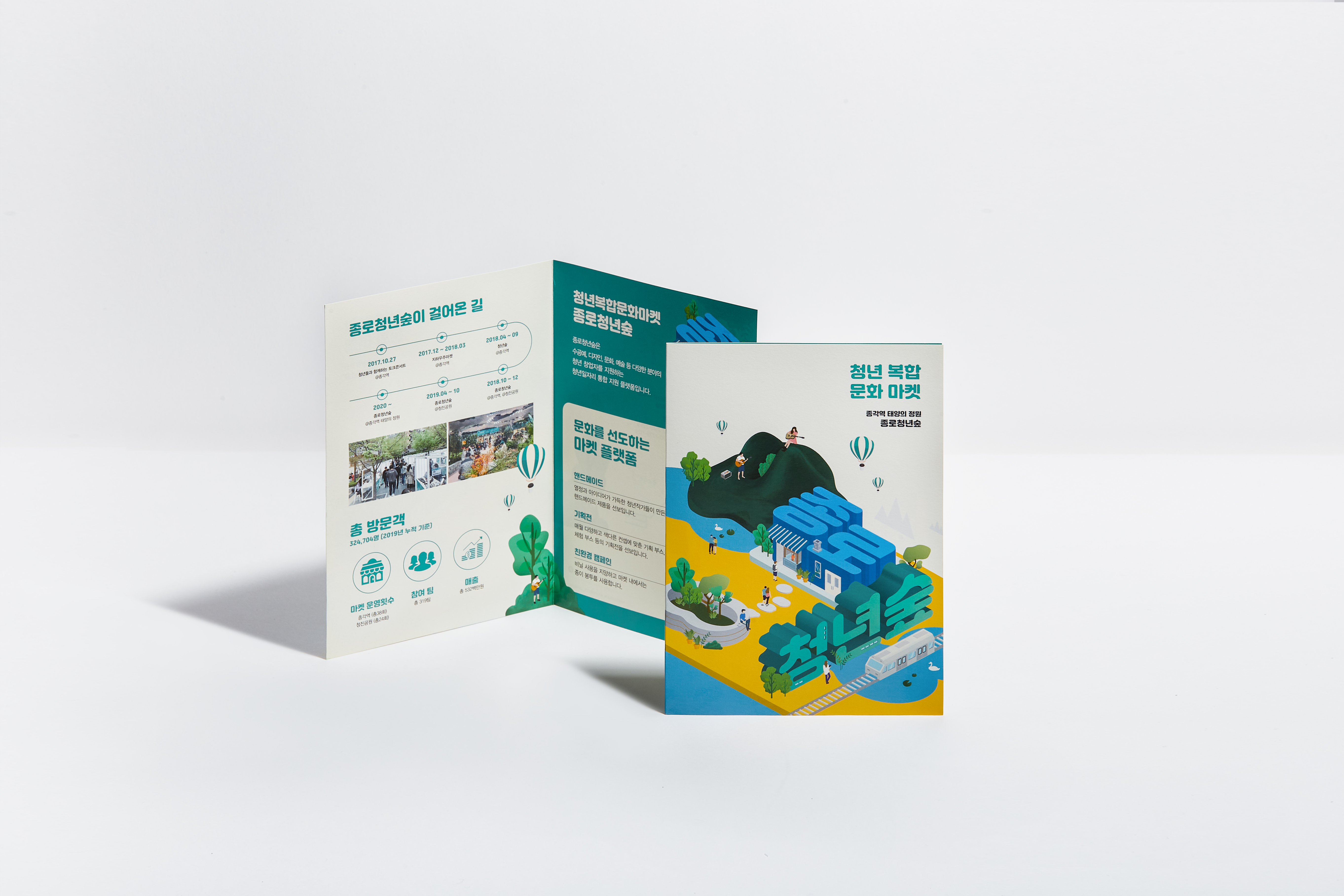 ‘2020년 종각역 청년복합문화마켓 종로청년숲’은 종각역 태양의 정원에 조성된 상설 마켓으로 수공예품, 아이디어 상품을 제작하는 청년 사업가들의 판로를 지원하는 역할을 합니다. 다양한 형태의 나무 일러스트와, 그린 톤의 키 컬러를 활용한 키 비주얼을 제작함으로써 ‘종로청년숲’이라는 타이틀에서 느껴지는 이미지를 직관적으로 구현했습니다. 청년 사업가들의 활기찬 에너지를 드러내기 위해 키 비주얼을 베리에이션하여 아트웍과 그래픽 아트를 곳곳에 배치했습니다.