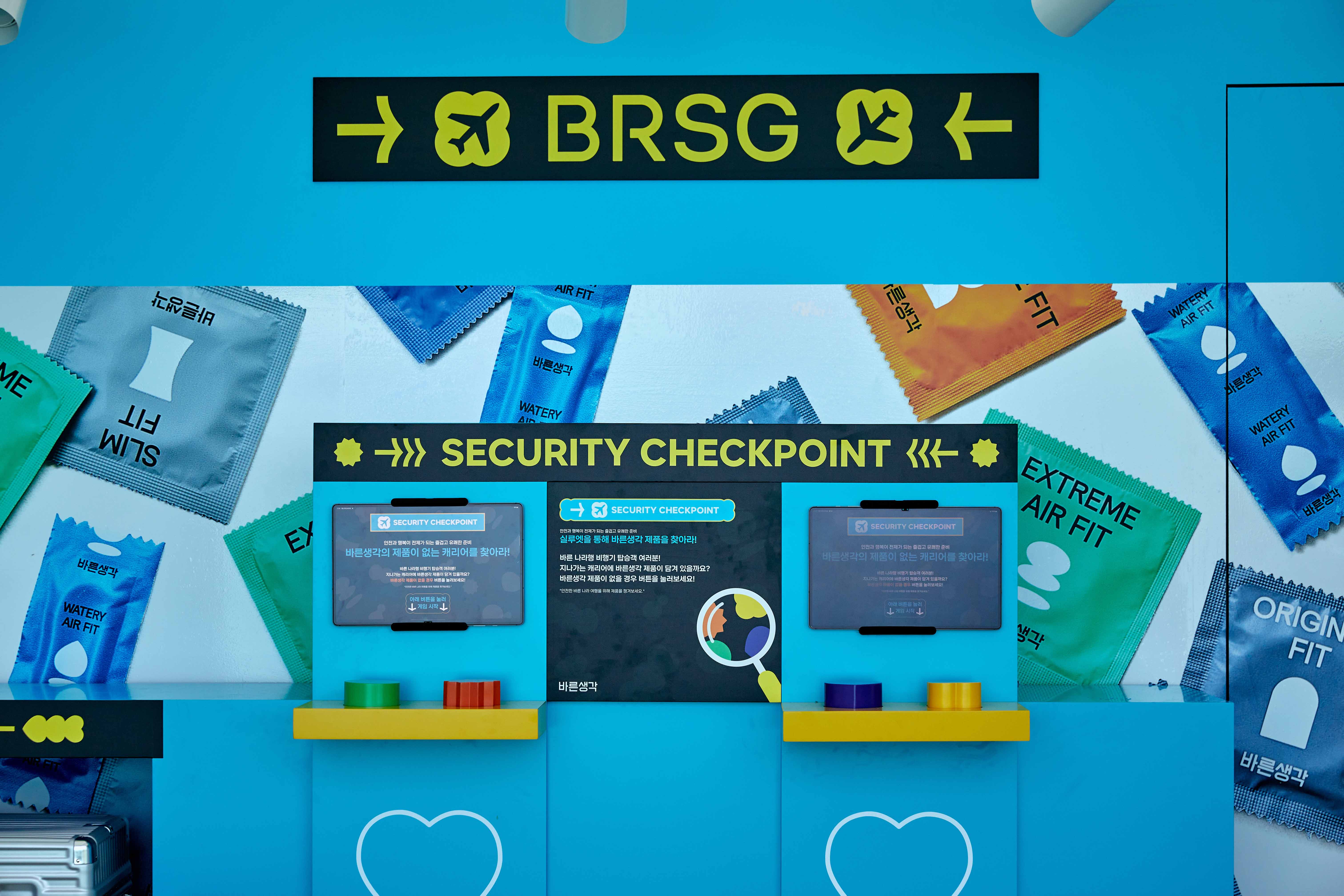 올영페스타 행사장 내 바른생각 부스를 연출했습니다. 공항을 콘셉트로 '여행 수하물에 안전을 위한 바른생각 용품을 챙긴다'는 이야기를 담았으며, 브랜드의 알록달록하고 친근한 아이덴티티를 활용해 공간 연출 그래픽을 디자인했습니다.