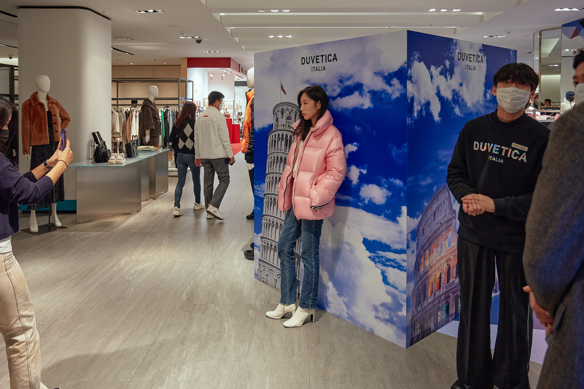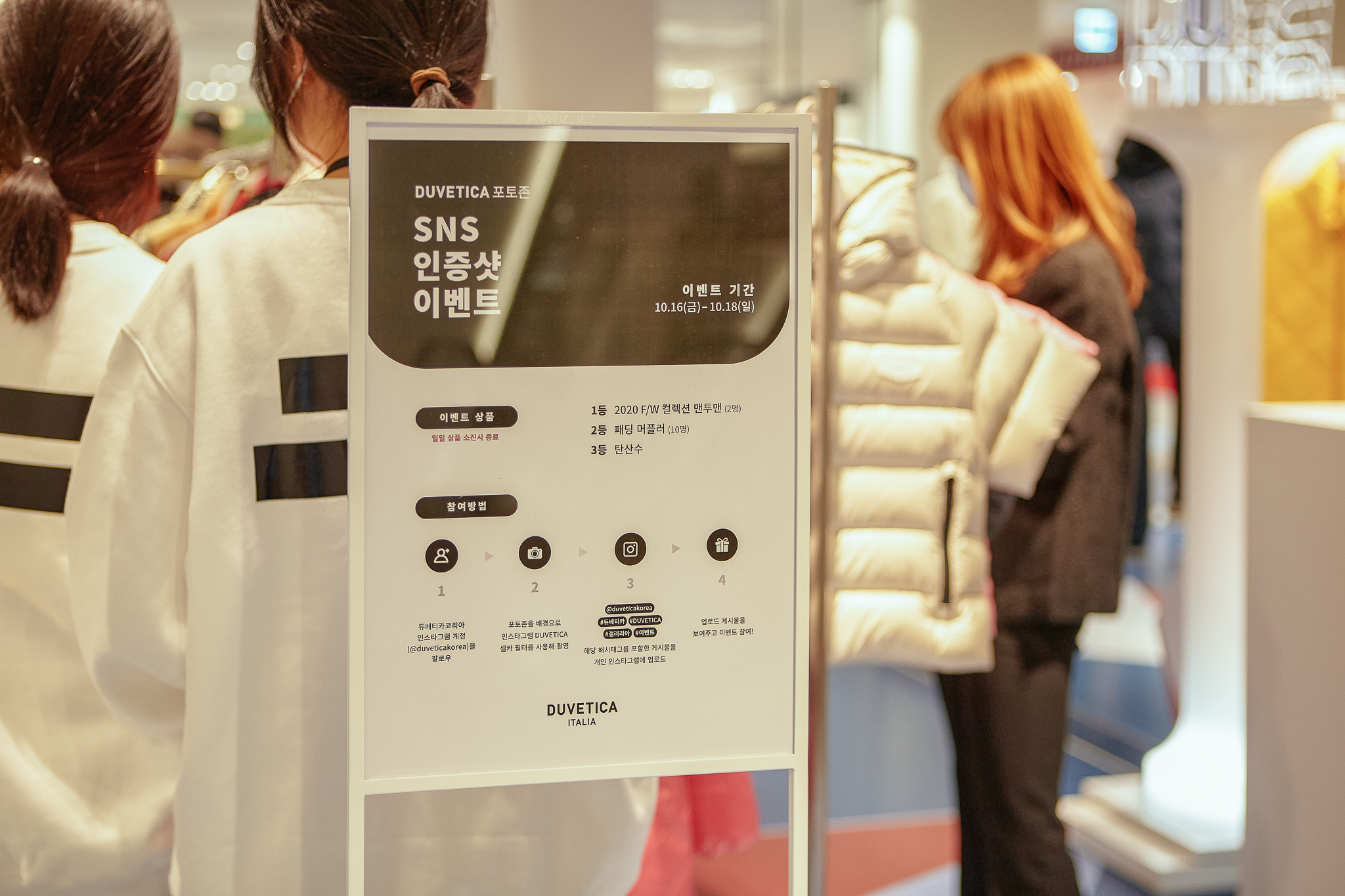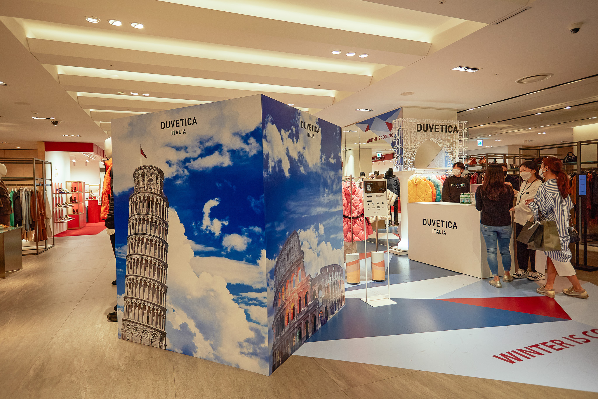 압구정 갤러리아백화점 내 조성된 듀베티카 팝업스토어에서 관람객을 대상으로 이벤트를 진행했습니다. 이탈리아의 대표 건축물인 콜로세움과 피사의 사탑 그래픽 포토월을 세우고, 이벤트 진행을 위한 데스크를 배치했습니다.