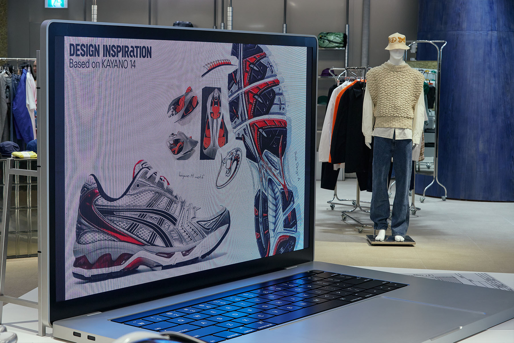‘아식스 젤 카야노 레가시 팝업’은 디자이너의 책상이라는 컨셉으로 젤 카야노 디자이너가 실제로 디자인하는 방식과 과정을 공간적으로 표현해 낸 전시입니다. 아식스와 젤 카야노 시리즈가 지난 30년간 담아온 헤리티지와 브랜드 아이덴티티를 구현하기 위한 젤 카야노 형태의 시각 연출물과 작업 공정을 느껴볼 수 있는 노트북 형태의 스크린을 제작하였습니다.