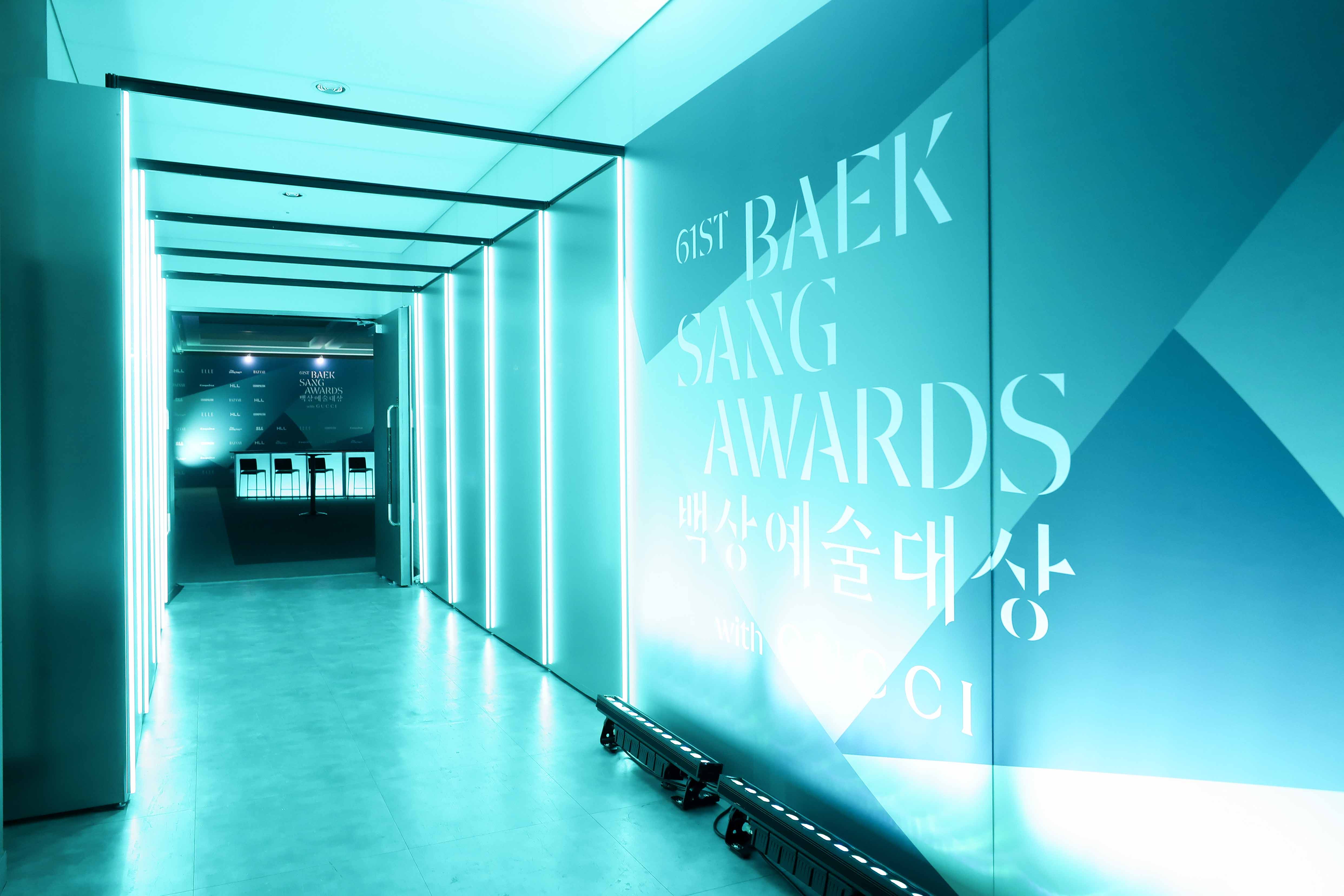 제 61회 백상예술대상 브랜드 가이드에 맞춰 리셉션 공간에 필요한 시각 요소들을 디자인했습니다. 백상예술대상의 아이덴티티를 유지하면서도, 공간 내 정보 전달이 효과적으로 이뤄질 수 있도록 정보 디자인을 세심하게 구성했습니다.