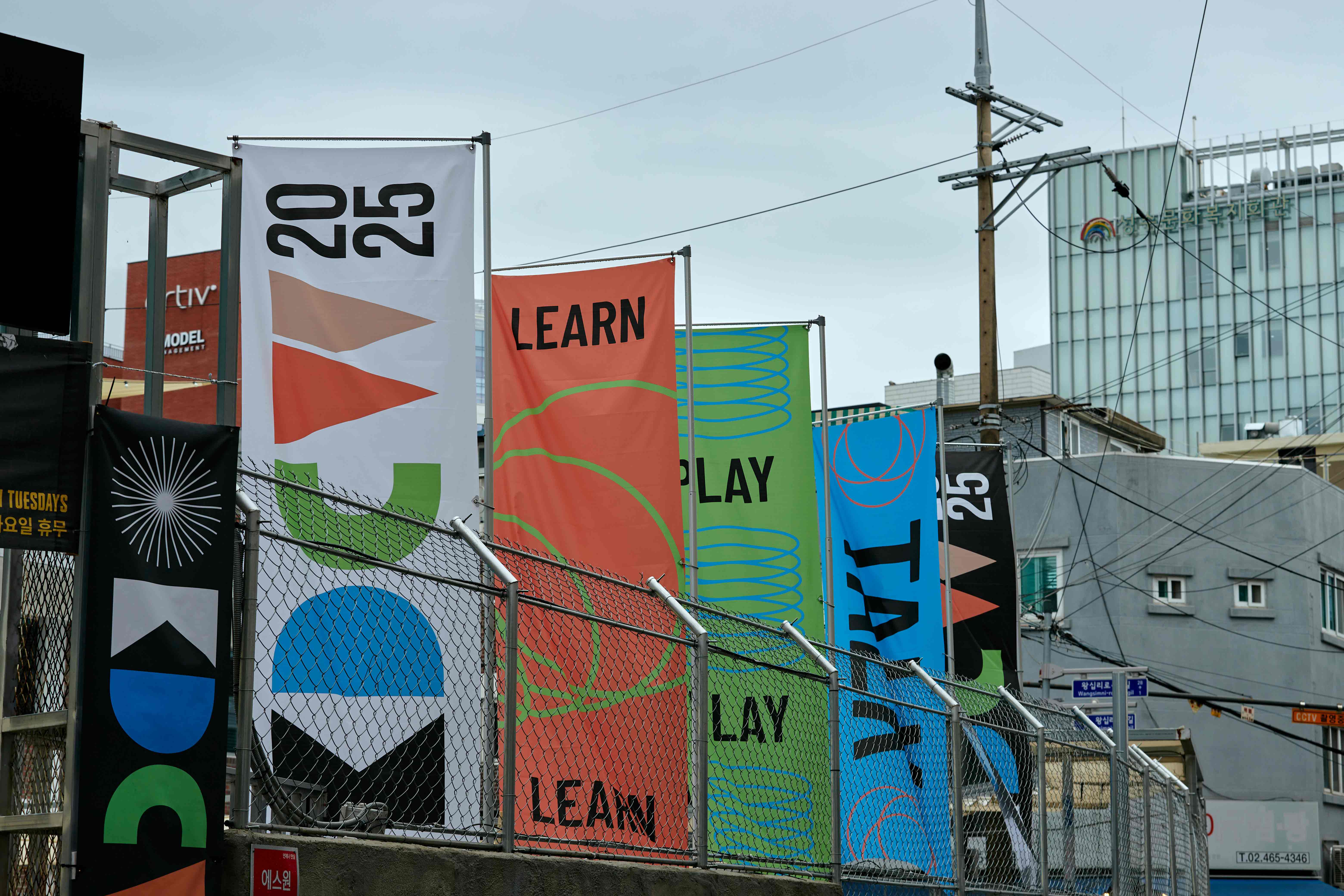 크래프톤 KDCW 2025의 시각 디자인은 키비주얼을 기반으로 전개되어 컨퍼런스 전반에 통일된 브랜드 경험을 구현했습니다. 'Talk, Play, Learn'이라는 핵심 컨셉을 중심으로, 연사자와 참여자가 소통하는 장을 시각적으로 구현하는 데 주력했습니다. 공간 그래픽, 인쇄물, 디지털 화면 등 다양한 접점에 키비주얼 언어를 일관되게 확장하고 적용했습니다. 특히 행사 공간별 컨셉에 맞춰 그래픽을 섬세하게 변주하여 각 장소의 아이덴티티를 효과적으로 표현했습니다. 이처럼 통합적인 시각 디자인은 참가자들이 컨퍼런스의 핵심 메시지에 몰입하고, 크래프톤만의 특별한 경험을 할 수 있도록 기여했습니다.