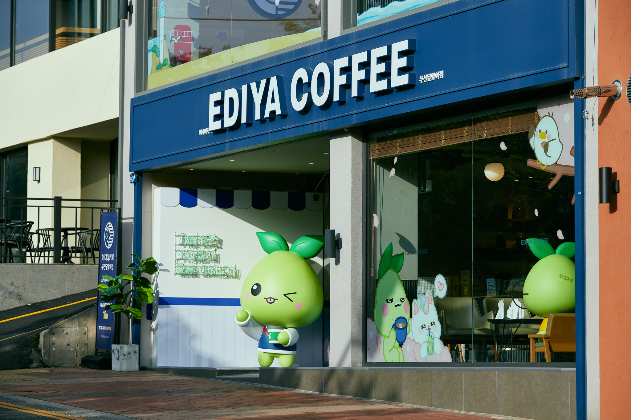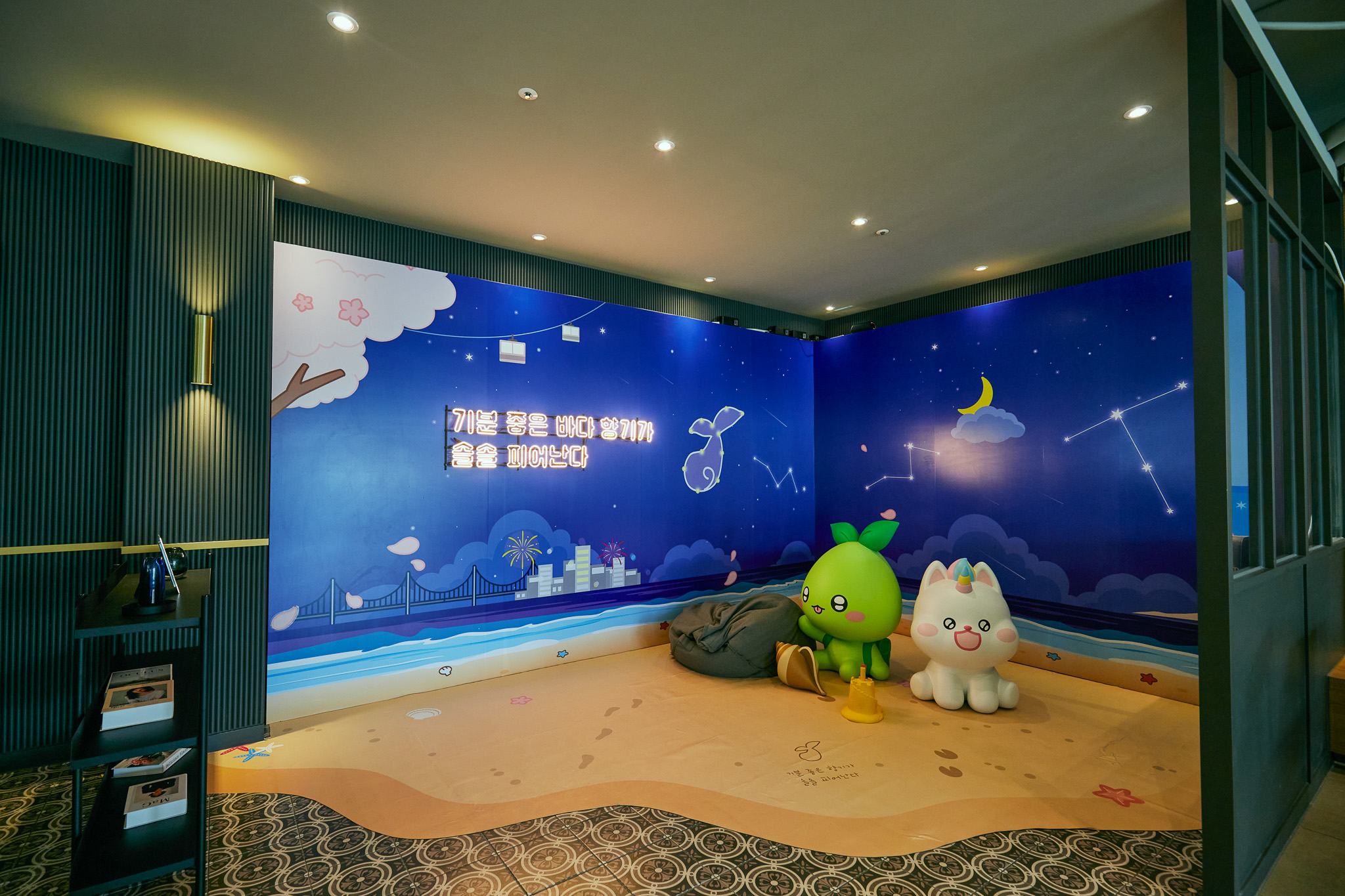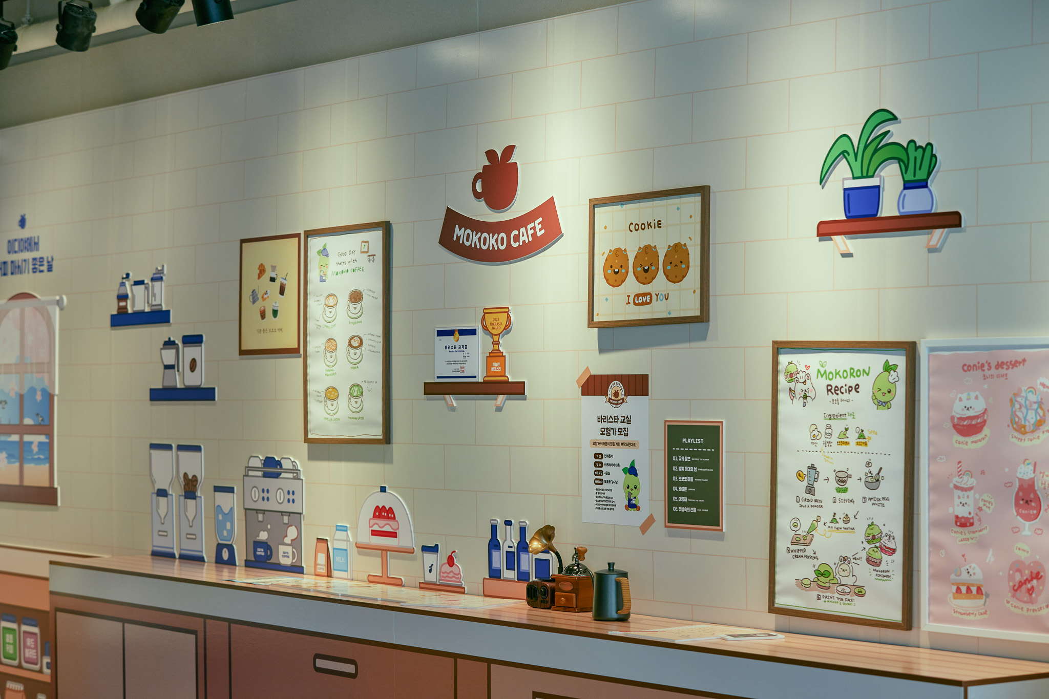 로스트아크와 이디야커피의 콜라보 팝업스토어인 ‘모코코 in 부산 팝업스토어’의 공간을 이디야카페 부산 달맞이점에 구현하였습니다. 1층은 바리스타가 된 모코코, 2층은 부산으로 여행 온 모코코를 컨셉으로, 1층과 2층 내외부 전체를 휴양지에 온 듯한 청량한 느낌의 모코코 테마로 연출했습니다.