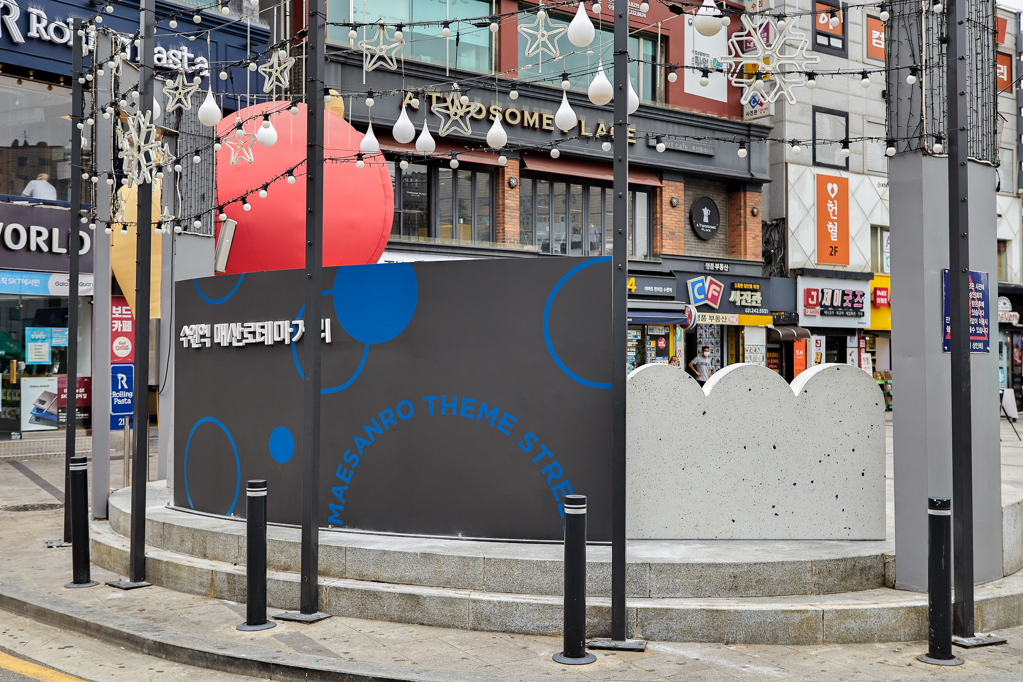 매산로테마거리 입구에 있는 무대 공간을 연출했습니다. 젊고 활기찬 분위기를 전달할 수 있는 메탈과 블루를 키 컬러로 사용하여 매산로의 아이덴티티를 강화하였습니다. 스테인리스 스틸, 돌 등 내구성이 강한 재료를 사용한 조형물을 배치하여 공공 공간의 지속가능성과 매체적 다이내믹을 표현했습니다.