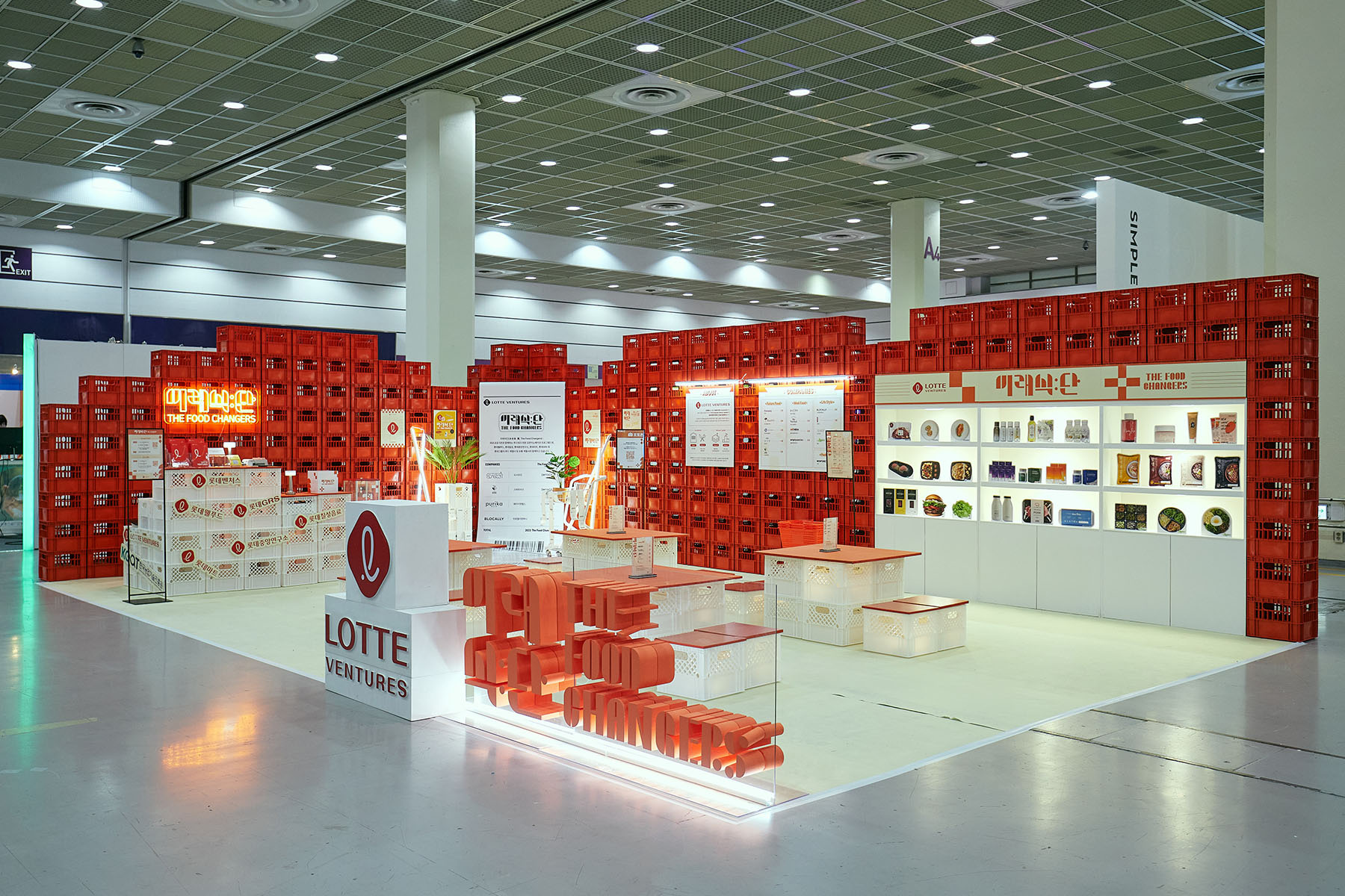 미래식단은 롯데벤처스, 한국농업기술진흥원이 푸드테크 스타트업을 발굴하는 프로그램입니다. 2023 농식품 테크 스타트업 창업 박람회에서 미래식단 3기의 전시 부스를 설치했습니다. 미래식단 부스는 밀크박스를 활용한 임팩트 있는 디자인과 눈길을 사로잡는 키 컬러로 여러 방문객의 관심을 끌었습니다.