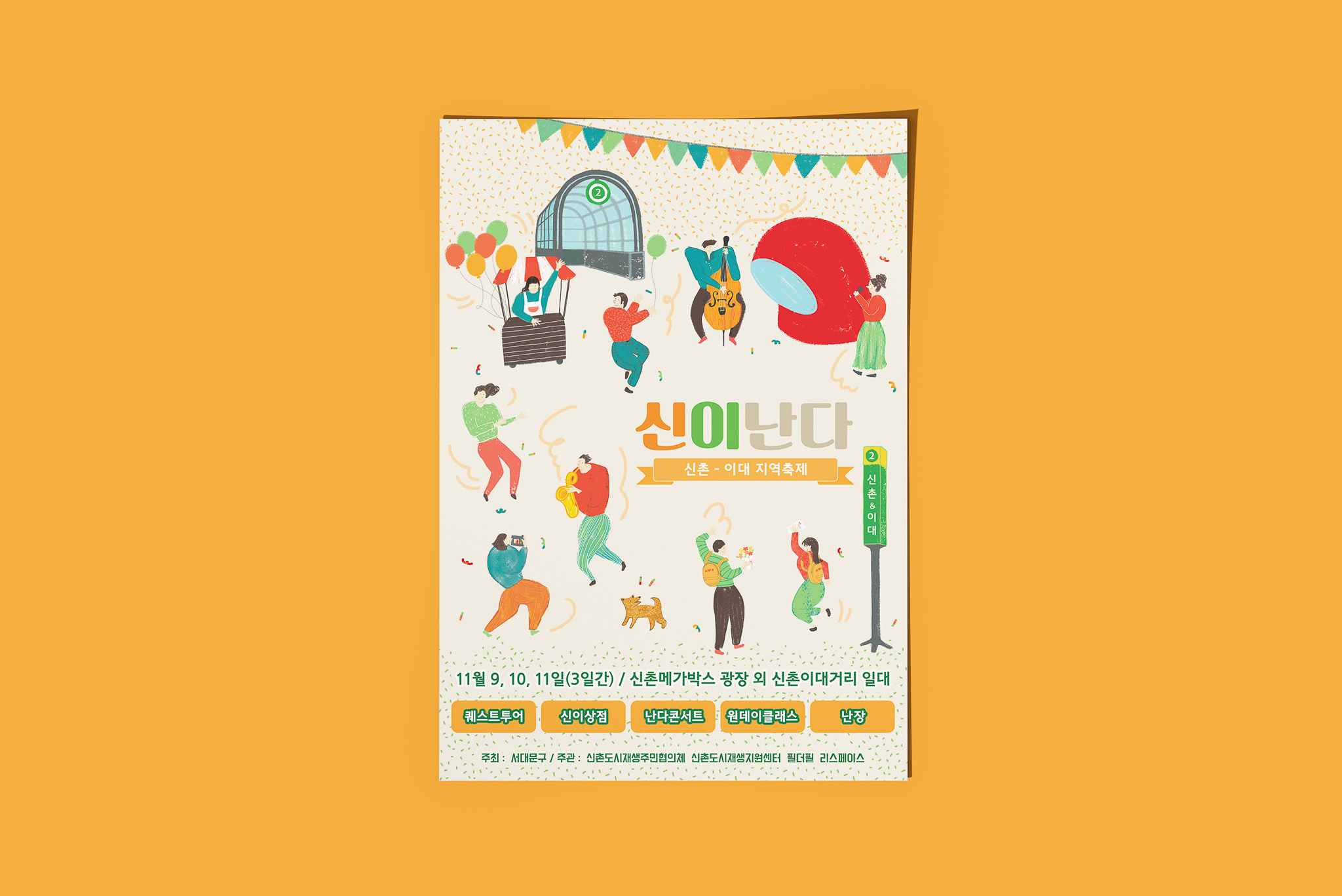 신촌-이대 지역 골목 활성화를 위해 기획한 주민 참여형 페스티벌입니다. 스탬프 투어, 원 데이 클래스 등 다양한 프로그램을 기획하고 운영했습니다. 지역 주민과 방문객 모두가 함께 어울릴 수 있도록 공연과 전시와 같은 문화 예술 컨텐츠를 제공하여 지역 활성화와 지역 문화 발전에 기여했습니다.