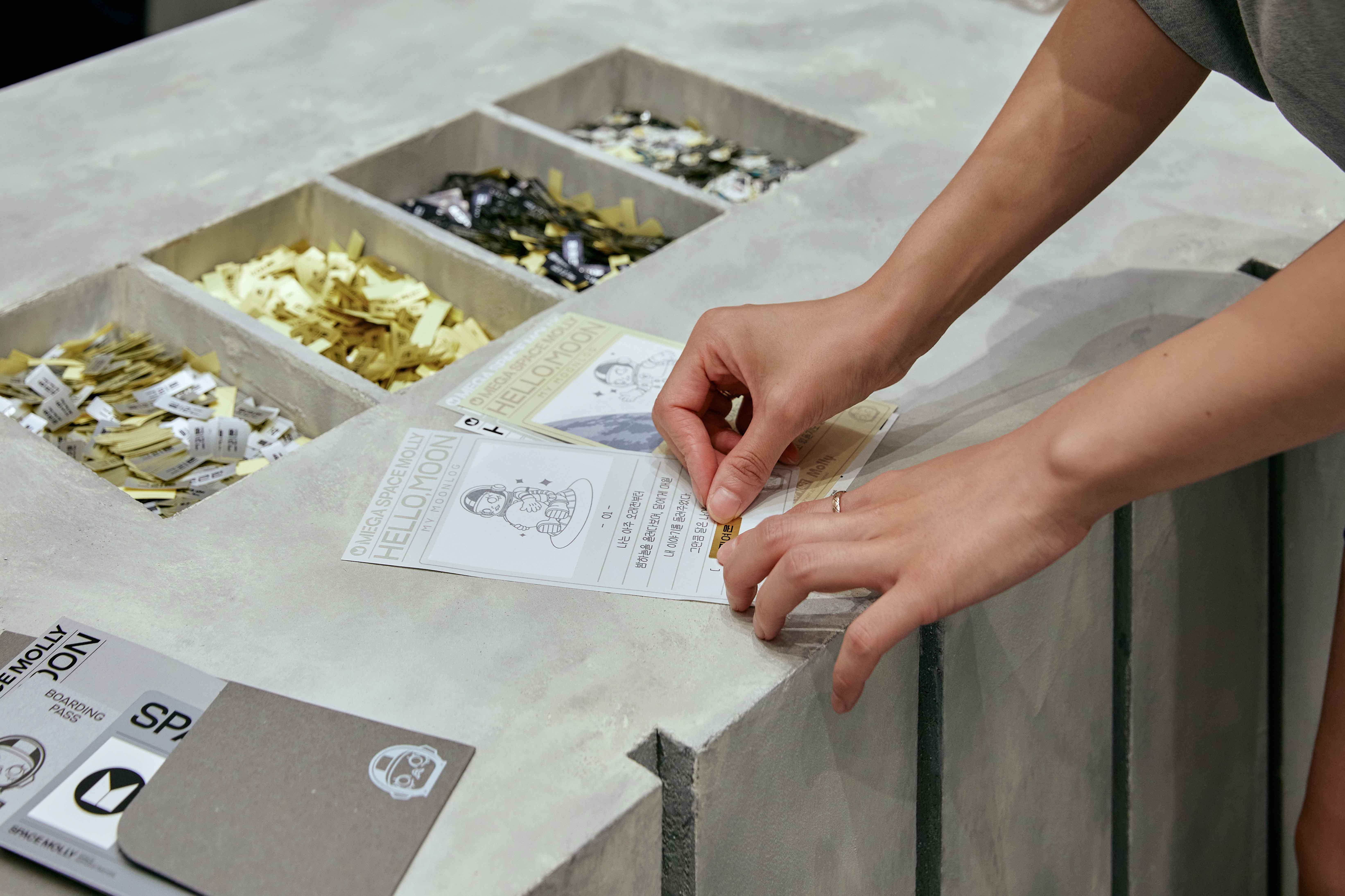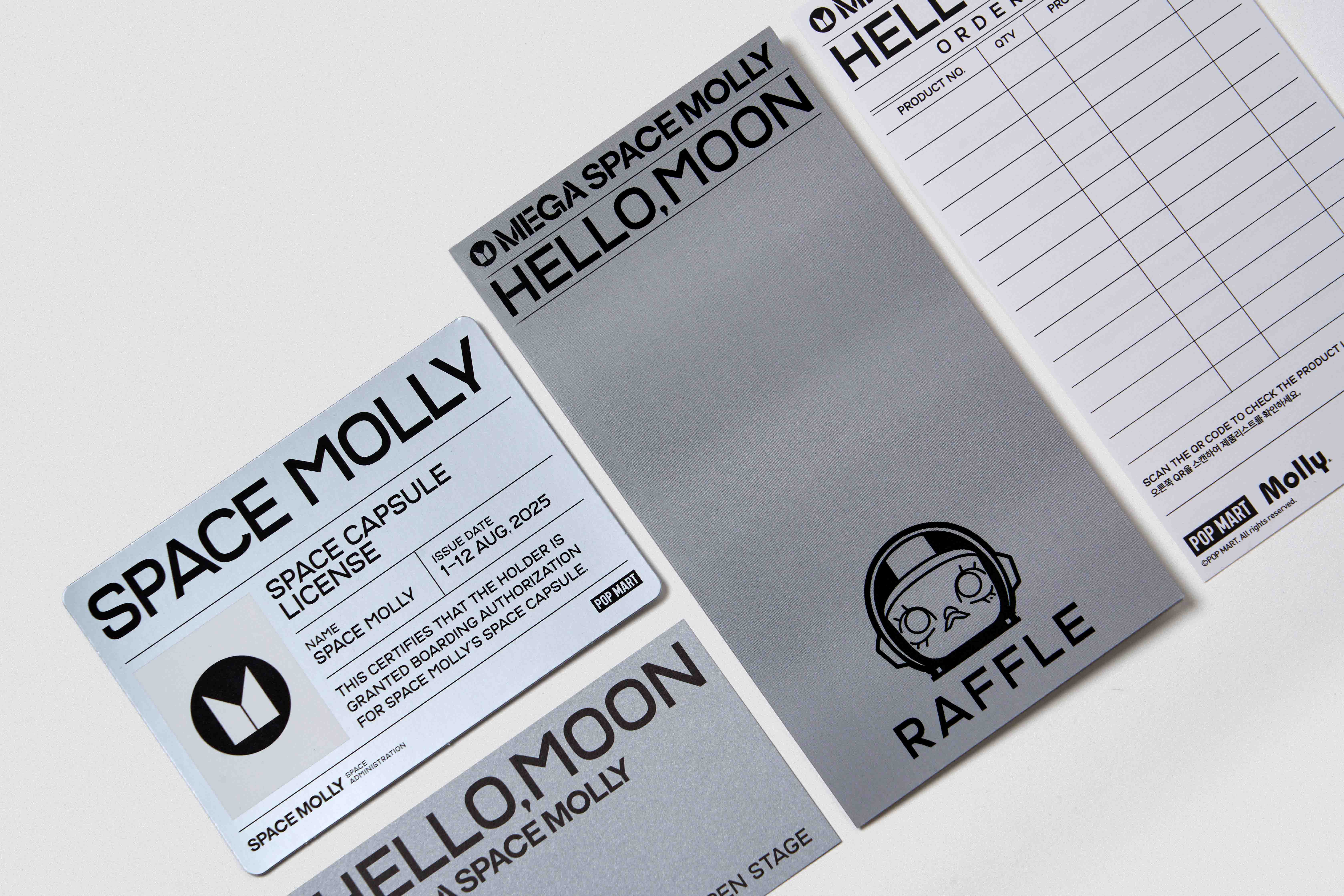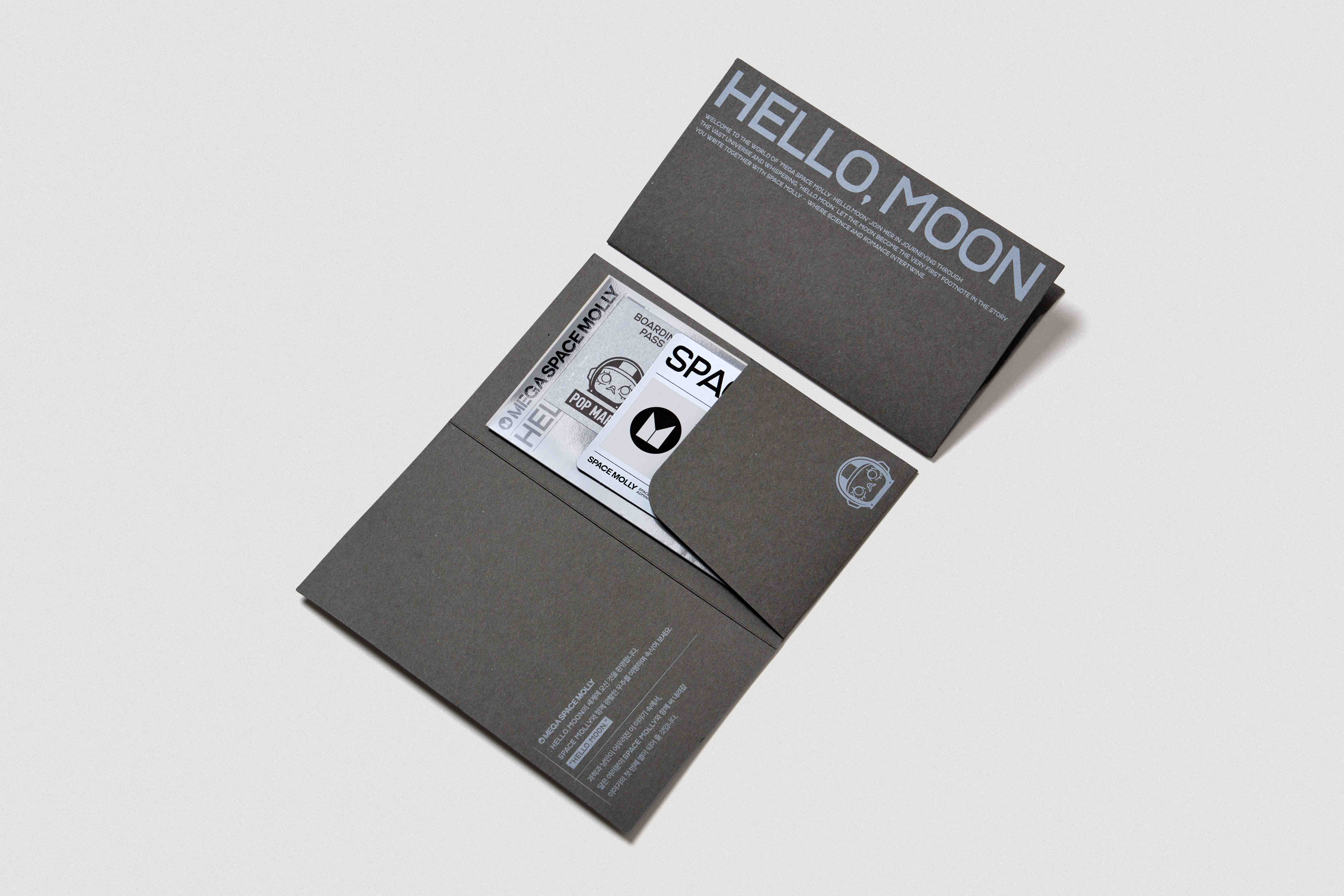 메가 스페이스 몰리 <HELLO, MOON> 전시회의 핵심 시각물은 '달에 도착한 메가 스페이스 몰리' 서사를 중심으로 디자인되었습니다. 오더시트, 프로그램지, 보딩패스, 리플렛 홀더 등 전반적인 인쇄물을 제작했습니다. 리플렛 홀더는 두께감 있는 무광 회색 색지로 거친 행성 질감을, 내부 지류는 은별색과 코팅으로 우주·미래지향적 이미지를 표현했습니다. 이는 전시회 컨셉을 효과적으로 전달하며 방문객에게 몰입도 높은 비주얼 경험을 선사했습니다.