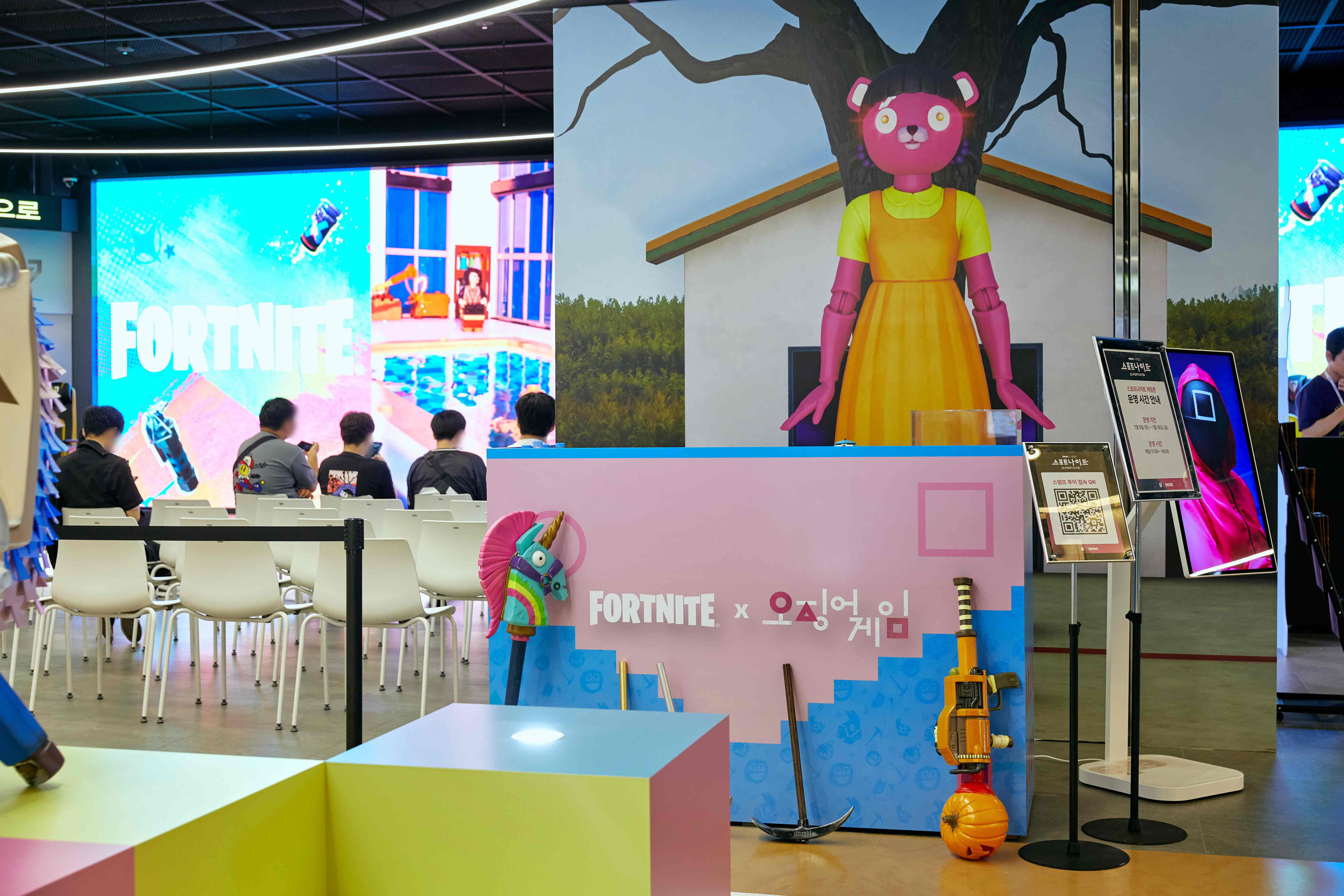 스포트나이트 랜파티를 위해 GGX 공간을 포트나이트 × 오징어게임 에셋으로 특별하게 테마 브랜딩했습니다. 공간 프로그램에 맞춰 오징어게임 운동장 콘셉트를 적용하고, 각 게임기는 전용 그래픽으로 랩핑 하여 주변과의 완벽한 조화를 이루었습니다. 주요 요소들은 가구 형태로 제작함으로써 공간 구조 변경을 최소화하고 운영의 유연성을 확보했습니다. 이처럼 제한된 공간 조건 속에서도 효율적이며 몰입감 높은 브랜드 경험을 제공하는 데 주력했습니다. 결과적으로, 방문객들의 두 IP의 독창적인 세계관에 완벽하게 몰입할 수 있는 환경을 성공적으로 구축했습니다.