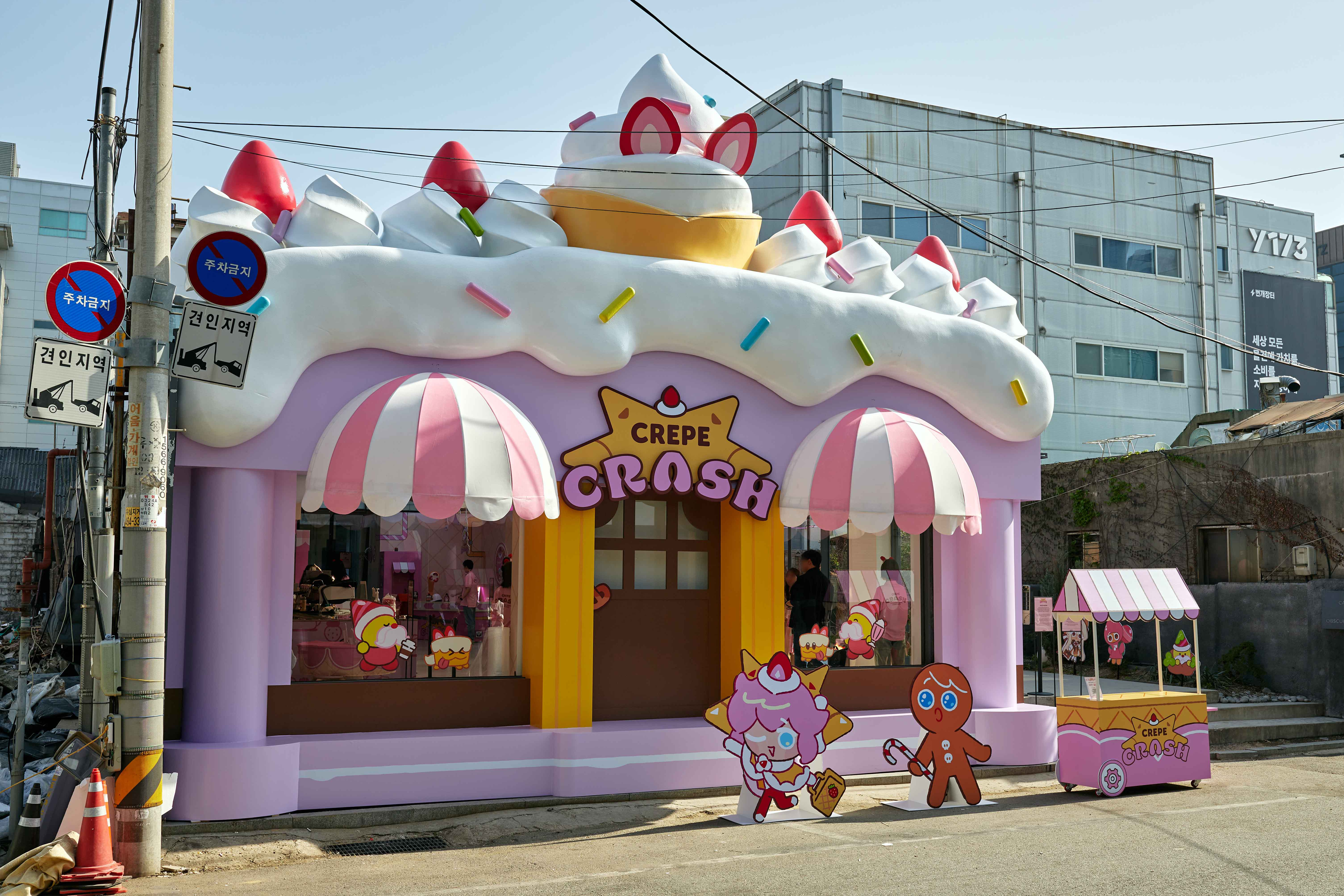 쿠키런:킹덤의 신규 캐릭터 딸기 크레페맛 쿠키 출시를 기념하여, 캐릭터의 매력을 강조한 팝업스토어 공간디자인을 진행하였습니다. 카페 외관은 게임 속 세계를 그대로 재현해 방문객들이 게임 속에 들어온 듯한 기분을 선사했습니다. 내부는 핑크와 네온 조명으로 딸기 크레페 공장의 달콤한 분위기를 담아냈고, 비밀 연구실을 독특하게 꾸며 색다른 체험을 제공하고 테이블 배치로 방문객들이 실제 손님처럼 게임의 세계관을 실감하도록 했습니다. 이를 통해 방문객들은 캐릭터와 게임의 세계를 더욱 가까이 느낄 수 있는 특별한 경험을 하게 되었습니다.
