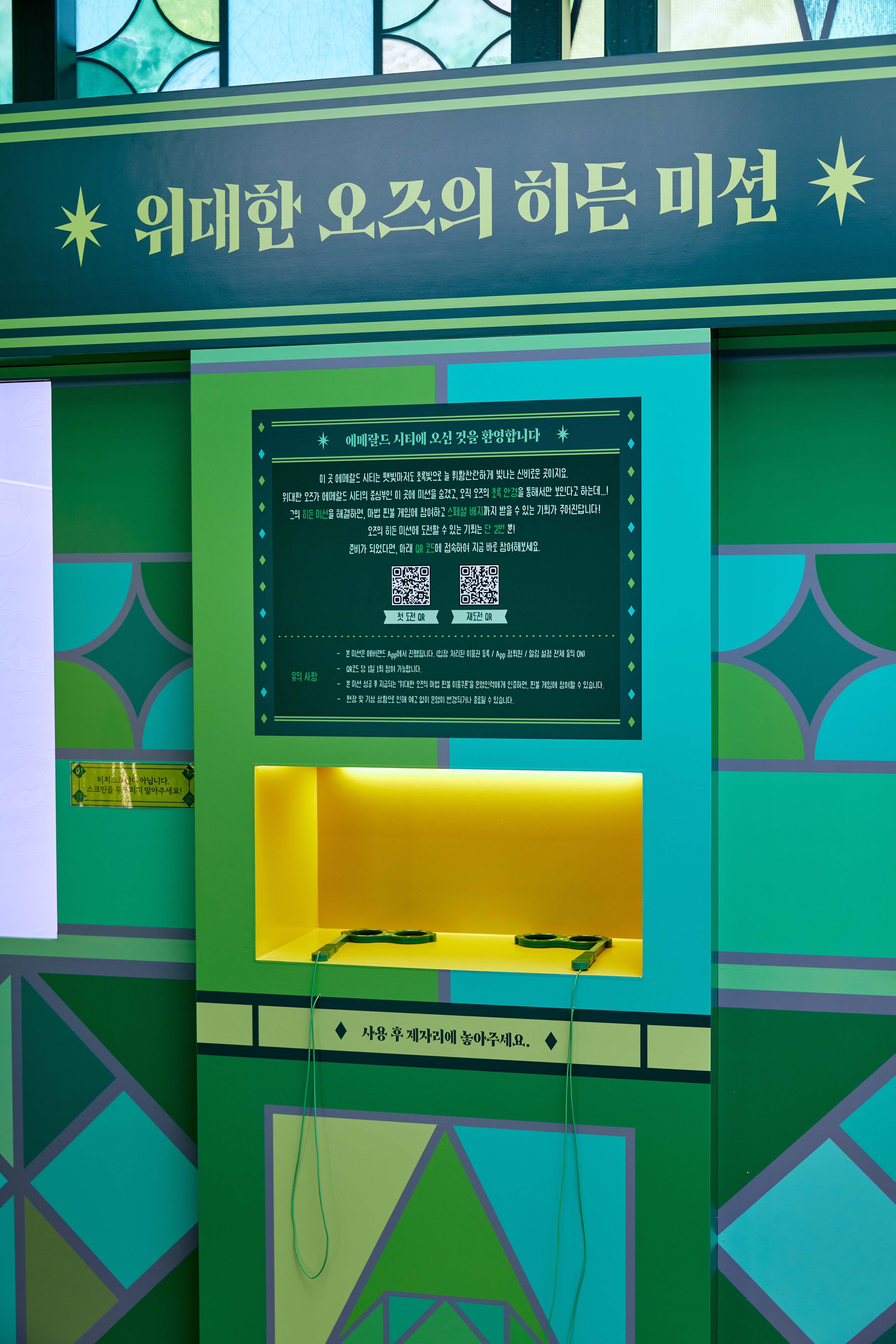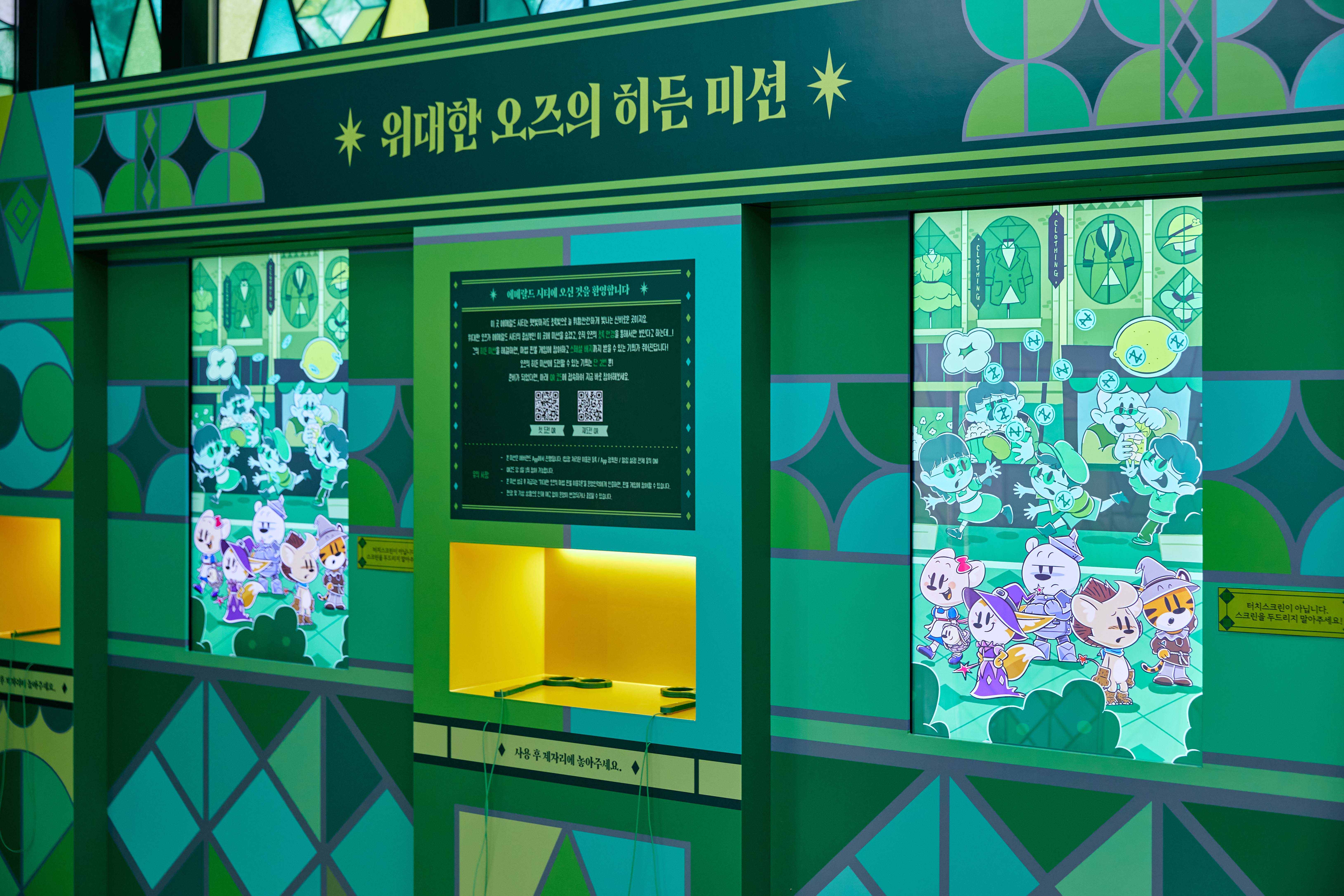 오즈의 마법사를 재해석한 '에메랄드 시티'를 배경으로 에버랜드 캐릭터와 연계한 체험 부스를 기획했습니다. 편광 필름 원리를 활용해 안경 착용 시에만 정답이 보이는 인터랙티브 OX 퀴즈와 대형 핀볼 게임을 연동하여 방문객의 몰입도를 높였습니다. 특히 가을에서 겨울(X-mas Fantasy)로 이어지는 시즌 흐름에 맞춰 그래픽과 연출을 리뉴얼함으로써 단발성 행사를 넘어선 지속적인 테마 경험을 제공했습니다.